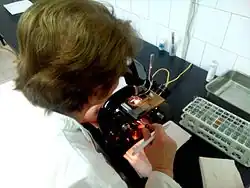 Первый работоспособный прототип электронного микроскопа был построен в 1932 году Э. Руска и М. Кнолль; в 1986 году за эту разработку Руски, вместе с другими разработчиками электронных микроскопов, была присуждена Нобелевская премия по физике. Серийное производство электронных микроскопов было начато в конце 30-х годов.