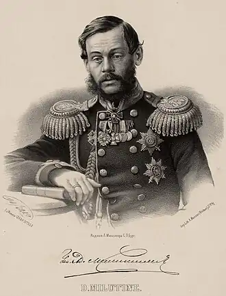 Граф (с 30 августа 1878) Дми́трий Алексе́евич Милю́тин (28 июня [10 июля] 1816, Москва — 25 января [7 февраля] 1912, Симеиз, Таврическая губерния) — военный и государственный деятель Российской империи, сподвижник императора Александра II, военный историк и теоретик. Военный министр (1861–1881), в этом качестве — основной разработчик и проводник военной реформы 1860-х годов; последний из русских подданных, носивший чин генерал-фельдмаршала.