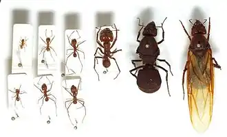 - Полиморфизм (от др.-греч. πολύμορφος «многообразный») — существование нескольких внешне отличающихся размерами и пропорциями форм у одного и того же вида, приспособленных к выполнению особых функций в популяциях или семьях данного вида (например, мелкие няньки, средние строители и фуражиры, крупные солдаты)