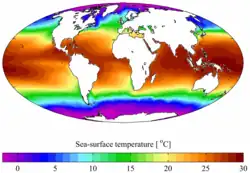 Вода обладает огромной теплоёмкостью, поэтому температура океана меняется гораздо медленнее, чем температура воздуха или суши. Близкие к океану районы имеют меньшие суточные и сезонные колебания температуры.