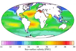 Под действием солнечной радиации вода испаряется и переносится на континенты, где выпадает в виде различных атмосферных осадков. Морские течения переносят нагретые или охлаждённые воды в другие широты и в значительной мере ответственны за распределение тепла по планете. Они перераспределяют избыточное тепло, полученное в тропиках, в направлении более высоких широт и глубоководных частей океана. Этот перенос сильнее в полярных регионах, где поверхностные воды становятся более плотными и опускаются в основном из-за высоких тепловых потерь[14].