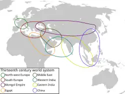 Заметными мир-системными событиями стали крестовые походы, в результате которых наладился канал торговли пряностями из Индии в Европу. В результате образования Монгольской империи в XIII веке с подконтрольными обширными территориями Евразии образовались стабильные торговые пути из Китая в Европу, что увеличило обмен инноваций между цивилизациями. Ещё одним важным событием стало включение Южной Индии в более тесные взаимоотношения с другими частями мир-системы, вследствие установления там власти мусульман и частичной исламизации населения.