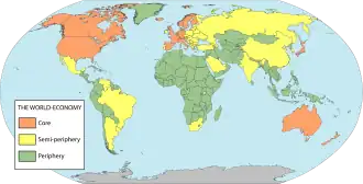 - Мир-экономики представляют собой системы обществ, объединённых тесными экономическими связями, выступающими в качестве определённых эволюционирующих единиц, но не объединённых в единое политическое образование. C XVI в. феодальная Европа трансформируется в капиталистическую мир-экономику. Весь современный мир представляет собой одну единственную мир-систему — капиталистическую мировую экономику. Капиталистическая мир-система состоит из ядра (наиболее высокоразвитые страны Запада), полупериферии (в XX веке — социалистические страны) и периферии (Третий мир). История ядра — история борьбы за гегемонию.