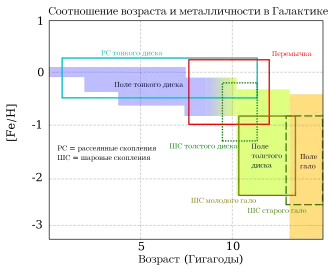 Возраст и металличность для различных подсистем Галактики