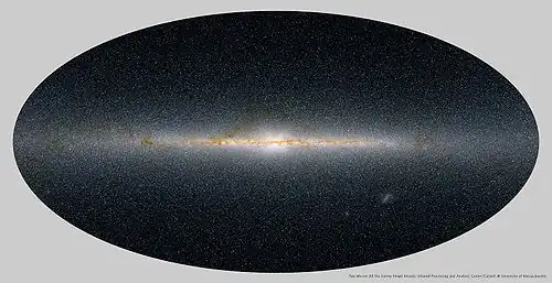 Млечный Путь в инфракрасном обзоре всего неба 2MASS. Бар наблюдается как некоторая асимметрия в центральной части изображения