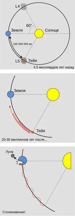 Вскоре после своего формирования Земля столкнулась с протопланетой Тейя. Удар пришёлся не по центру, а под углом (почти по касательной). В результате ядра планет слились, а фрагменты их силикатных мантий были выброшены на околоземную орбиту[7]. Из этих обломков собралась прото-Луна и начала обращаться по орбите с радиусом около 60 000 км.