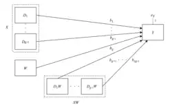 В этом случае роль как модератора достигается путём оценки , параметра для члена взаимодействия[2].