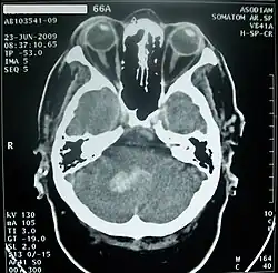 Кровоизлияние в мозжечок обычно проявляется головокружением, тошнотой и повторной рвотой при сохранении сознания. Больных часто беспокоит головная боль в затылочной области, у них обычно выявляются нистагм и атаксия в конечностях. При возникновении мозжечково-тенториального смещения или вклинении миндалин мозжечка в большое затылочное отверстие развивается нарушение сознания вплоть до комы, геми- или тетрапарез, поражения лицевого и отводящего нервов[43].