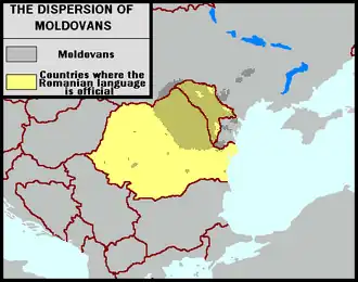 Географическое распределение молдаван. Жёлтым цветом помечены страны, где румынский и молдавский языки обладают официальным статусом.