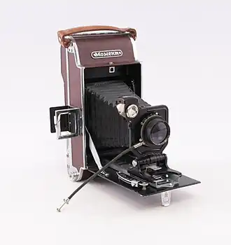 - Фотоаппарат имел складной корпус, изготовленный из тонкого стального листа и покрытый дерматином.