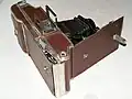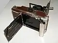 - Передняя панель фотоаппарата открывалась, затем принудительно выдвигался мех с оправой объектива и фотографическим затвором.