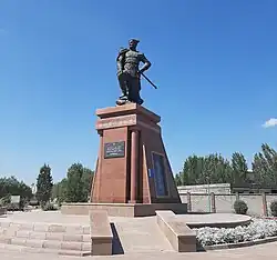 - памятник в полный рост на въезде в пос. Бауыржан Момышулы (районный центр Жуалынского района, Жамбылской области);