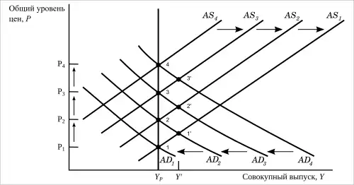 По мнению монетаристов, инфляция возникает в случае, когда темпы роста количества денег превышают темпы роста экономики. В начальный период население не ожидает долговременного роста цен и рассматривает каждое повышение цен как временное. Субъекты экономики продолжают хранить количество наличности, необходимое для поддержания своих потребностей на привычном для них уровне. Однако, если цены продолжают расти, то население начинает ожидать дальнейшего роста цен. Так как покупательная способность денег снижается, то они становятся дорогим способом хранения активов, и люди будут стараться уменьшать сумму хранимой наличности. Это поднимает цены, заработную плату и номинальные доходы. В результате реальные денежные остатки продолжают снижаться. На данной стадии цены растут быстрее, чем количество денег. Если темп роста денежной массы стабилизируется, то и темп роста цен также стабилизируется. При этом рост общего уровня цен может показывать разные соотношения с ростом количества денег. При умеренной инфляции цены и денежная масса возрастают, как правило, одинаковыми темпами. При высокой же инфляции цены растут в несколько раз быстрее денежного обращения, приводя к снижению реальных доходов[10].