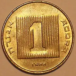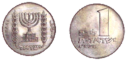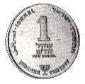 1 агора | 21 | 1,3 | Аверс: три ячменных колоса; текст «Израиль» на иврите и арабском языке. Реверс: цифра «1»; текст «агора» и год выпуска на иврите; |