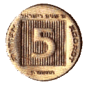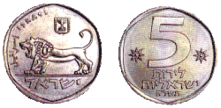 5 новых агор | 18,5 | 0,9 | Аверс: Герб Израиля; текст «Израиль» на иврите, арабском и английском языках; Реверс: цифра «5»; текст «новых агор» и год выпуска на иврите. |