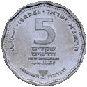 5 шекелей | 24 | 6 | Аверс: двойной рог изобилия; Герб Израиля; текст «Израиль» на иврите, арабском и английском языках. Реверс: цифра «5»; текст «шекелей» и дата выпуска на иврите; две стилизованных восьмиконечных звезды. |
