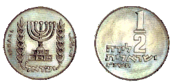 1⁄2 фунта | 24,5 | 6,8 | Аверс: Герб Израиля; текст «Израиль» на иврите, арабском и английском языках; Реверс: цифра «1/2»; текст «израильский фунт» и год выпуска на иврите. |