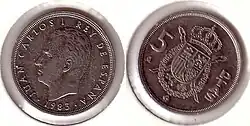 После смерти Франсиско Франко в 1975 году произошел переход Испании от диктатуры к демократии. В обращении появились монеты с портретом короля Хуана Карлоса I. В 1980 году были выпущены юбилейные монеты в 50 сентимо, 1, 5, 25, 50 и 100 песет, посвящённые Чемпионату мира по футболу 1982 года[1].