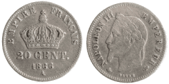 | 1866 | Серебро | 5 г | 23 мм | 1866 — 1870 | рубчатый | Номинал | Наполеон III | Всего выпущено: — 82 744 251 шт. |