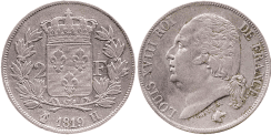 | 1816 | Серебро | 5 г | 23 мм | 1816 — 1824 | рубчатый | Номинал | Людовик XVIII | Всего выпущено: — 4 383 619 шт. |