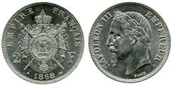 | 1863 | Серебро | 2 г | 18 мм | 1863 — 1870 | рубчатый | Корона | Наполеон III | Всего выпущено: — 80 002 929 шт. |