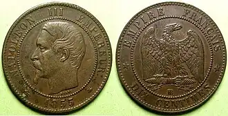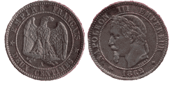 | 1861 | Бронза | 1 г | 15 мм | 1861—1870 | рубчатый | Орёл | Наполеон III | Всего выпущено: — 40 892 792 шт. |