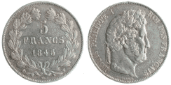 | 1845 | Серебро | 1 г | 15 мм | 1845 — 1848 | рубчатый | Номинал | Луи Филипп | Всего выпущено: — 8 424 604 шт. |