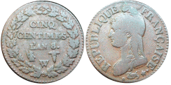 | 1796 | Бронза | 5 г | 23 мм | 1796-1798 (4-5 годы Республики) | рубчатый | Номинал | Республика | Всего выпущено: — неизвестно |