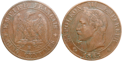 | 1852 | Бронза | 10 г | 30 мм | 1852 — 1861 | рубчатый | Орёл | Наполеон III | Всего выпущено: — 258 813 784 шт |