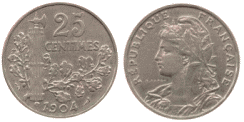 | 25 сантимов 1904. Дизайнер Анри Пати | ||||||||||||