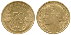 | 50 сантимов 1931. Дизайнер Пьер Александр Морлон | ||||||||||||