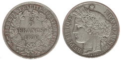 | 5 франков 1870. Дизайнер Огюстен Дюпре | ||||||||||||