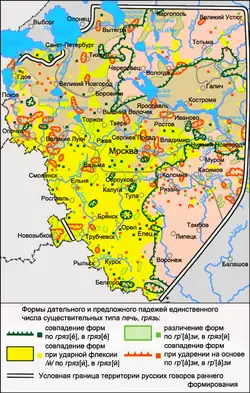 В формах дательного и предложного падежей в северном наречии, исключая часть западных севернорусских говоров, а также в восточных южнорусских и восточных среднерусских говорах представлено окончание -е (-ê). В северо-западных говорах наблюдается совпадение окончаний родительного, дательного и предложного падежей в -и (-ы): нет воды́, к воды́, в воды́; без земли́, к земли́, на земли́. В юго-западных говорах совпадение окончаний указанных падежей последовательно реализуется только у существительных с основой на мягкую согласную: из земли́, к земли́, в земли́. У существительных с основой на твёрдую согласную окончание -ы характерно только для родительного и дательного падежей: нет воды́, к воды́, в воде́[25][26].