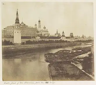 В 1817 году на Ивановской площади устроили плац для военного парада, для чего в одну ночь был разобран древний храм Николы Гостунского. В 1823 году по проекту В. П. Стасова надстроили царский дворец, который вновь оказался мал, и уже в 1824 году купленный ранее казной дом митрополита был также надстроен и стал с 1831 года именоваться Малым Николаевским дворцом[46]. В начале 1830-х годов начались реставрационные работы на древних памятниках Кремля. Одним из первых академиком Ф. Г. Солнцевым и архитектором П. А. Герасимовым был восстановлен в 1836—1849 годах Теремной дворец. В 1836 году архитектор О. Монферран поднял и установил на специальном постаменте Царь-колокол, упавший в пожар 1737 года и пролежавший всё это время в яме[46].
