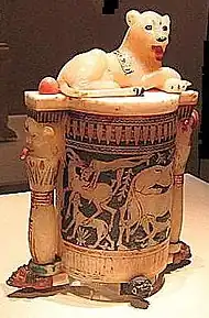 Косметический сосуд из кальцитового алебастра, увенчанный львицей, изображающей богиню Баст; из гробницы Тутанхамона, 1323 год до н. э. Каирский египетский музей.