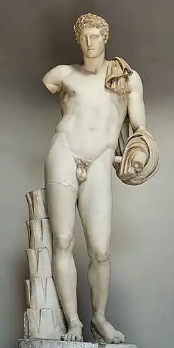 Статуя Гермеса: также «Антиной Бельведерский», римская копия оригинала Праксителя (IV век до н. э.), некогда находившегося в священной Олимпии. Статую ошибочно считали изображением любимца императора Адриана, поскольку её нашли в 1543 году недалеко от замка Святого Ангела (мавзолея Адриана).