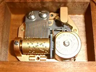 Музыкальная шкатулка — механический программный музыкальный инструмент, производящий звуки в результате зацепления выступов, расположенных на вращающемся цилиндре, с зубцами металлического гребня[1]. Мелодия, воспроизводимая шкатулкой, определяется длиной зубцов на гребне и порядком расположения выступов[1], фактически является примитивнейшим программируемым механическим устройством. Привод может быть механическим (от заводной спиральной ленточной пружины, которую взводят рукояткой или заводным ключом, как у часов), так и электрическим, от маленького электродвигателя с редуктором. Инструмент был популярен в XIX и начале XX веков до распространения граммофонов, производится и сегодня, зачастую музыкальные шкатулки продаются как сувениры.
