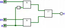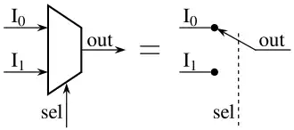 — информационные входы, — вход управления, в зависимости от его состояния выбирается один из входов для передачи на выход . На рисунке справа изображена эквивалентная схема этого мультиплексора.]]
