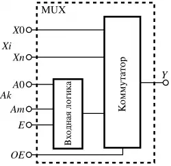 Схематически мультиплексор можно изобразить в виде коммутатора, обеспечивающего подключение одного из нескольких входов (их называют информационными) к одному выходу устройства. Коммутатор обслуживает управляющая схема, в которой имеются адресные входы и, как правило, разрешающие, иначе называемые стробирующие.