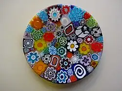«Миллефио́ри» (итал. millefiori — тысяча цветов) — разновидность изделий «мозаичного стекла», технология которых происходит от античных муррин. Основой создания изделий в технике миллефиори служат специальные стеклянные «прутики», имеющие в сечении нужный мастеру рисунок. Это может быть не только цветок, но и звезда, геометрическая фигура. Чтобы получить такую стеклянную палочку, некоторое количество расплавленного стекла наматывается на железный прут и раскатывается по плоской поверхности. Из него формируется дротик, который помещается затем в соответствующую форму. Далее мастер повторяет операцию, добавляя необходимое количество слоёв цветного стекла. Когда дротик готов (обычно он имеет около 15 см в длину и около 8 см в диаметре), он снова нагревается и к обоим его концам прикрепляются железные прутья. Затем он вытягивается, становясь похожим на длинный и тонкий карандаш. Этот «карандаш» можно скручивать, протягивать через специальные профилированные отверстия, придавая ему в поперечном сечении рифлёную или звёздчатую форму. После этого «карандаш» нарезают поперёк на сотни фрагментов: «плашек», или «шайбочек», диаметром три—пять мм, каждая из которых будет иметь на срезе заданный мастером «цветок»[13].
