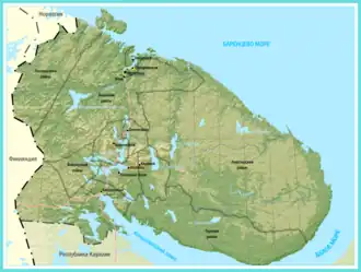 На западе граничит с Норвегией и Финляндией, на юге с Республикой Карелия и через Белое море с Архангельской областью. Омывается Белым и Баренцевым морями. Протяжённость — 550 км с запада на восток и 400 км — с севера на юг[5].