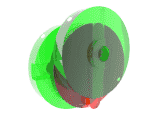 Средний диск вращается вокруг своего центра с той же самой скоростью, что входной и выходной валы. Центр среднего диска движется по окружности (дважды за один оборот) вокруг средней точки между входным и выходным валами.