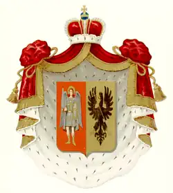 - ↑ Щит разделен перпендикулярно на две части. В правой части герб Великого Княжества Киевского (поле червленое, а не лазурное); в червлёном поле Ангел в одежде серебряной, держащий в правой руке меч, а в левой золотой щит. В левой части герб Великого Княжества Черниговского: в золотом поле чёрный одноглавый орел с распростёртыми крыльями и с золотой короной на голове, держащий в левой лапе большой золотой крест. Щит покрыт княжеской мантией и российско-княжеской шапкой.