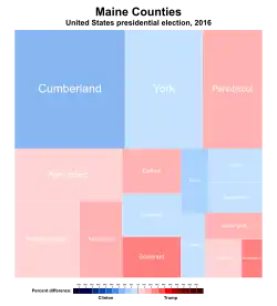 С 1969 года два из четырёх голосов выборщиков штата Мэн присуждаются в зависимости от победителя выборов по всему штату; два других достаются тем, кто набрал наибольшее количество голосов в каждом из двух округов конгресса штата. Любой другой штат, кроме Небраски, отдаёт все свои голоса выборщиков кандидату, который выигрывает всенародное голосование в целом по штату, независимо от результатов в округах. Мэн впервые разделил свои голоса на выборах в 2016 году, и сильные результаты Дональда Трампа в более сельских районах центрального и северного Мэна позволили ему получить один из четырёх голосов штата в Коллегии выборщиков[9].