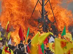 Посвящение этого праздника огню в более поздней зороастрийской традиции несомненно. В день Навруза ещё с Ахеменидского и Сасанидского периодов в храмах совершались поклонения огню. Иранские правители того периода принимали в этот день подарки от покоренных народов[21]. Огни разжигались повсюду, начиная с самого высокого места на крышах домов и кончая свечами на праздничных столах[22]. В настоящее время эти обычаи частично сохранились. Так, в некоторых районах Азербайджана «на всех холмах разжигаются костры»[23]. Люди становятся в круг вокруг огня и исполняют фольклорные песни[24]. Свечи также являются атрибутами праздничных столов в день «Навруза» и предшествующих ему дней (приготовления к нему начинаются за несколько недель до праздника)[25].