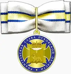 - ↑ Закон Псковской области от 25 октября 2018 года «О наградах Псковской области». Дата обращения: 9 марта 2020. Архивировано 16 февраля 2019 года.