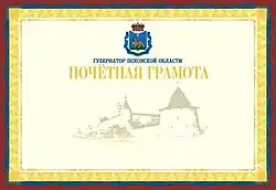 Почётная грамота Губернатора Псковской области является высшей наградой руководителя высшего исполнительного органа государственной власти Псковской области, учреждённой в целях поощрения граждан Российской Федерации, иностранных граждан, организаций и трудовых коллективов организаций за особые заслуги перед Псковской областью, достижение высоких показателей при осуществлении государственной, трудовой, общественной и уставной деятельности. Награждение Почётной грамотой Губернатора Псковской области осуществляется указом Губернатора Псковской области в соответствии с Положением о Почётной грамоте Губернатора Псковской области. |
