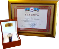 - ↑ Закон Республики Саха (Якутия) от 15 июня 2004 года № 135/1-З N275-III «О государственных наградах Республики Саха (Якутия)». Дата обращения: 15 октября 2022. Архивировано 8 августа 2020 года.