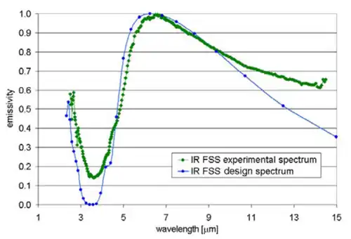 Доказательство принципа работы наноантенны начиналось с изделия на кремниевой подложке площадью 1 см2, на которой с помощью печати была нанесена решётка наноантенны, заполняющая эту площадь. Устройство было протестировано с помощью инфракрасного света в диапазоне от 3 до 15 мкм. Пик излучения оказался на длине волны 6.5 микрон и достигал термоэмиссионной эффективности 1. Термоэмиссионная эффективность 1 означает, что наноантенна поглощает все фотоны определённой длины волны (в данном случае 6.5 мкм), которые падают на устройство.[9] Сравнивая экспериментальный и моделируемый спектры, мы видим, что экспериментальные результаты находятся в согласии с теоретическими ожиданиями (рис. 3). В некоторых областях термоэмиссионная эффективность наноантенны была ниже, чем по теоретическим расчётам, но в других областях, а именно при длине волны около 3.5 мкм, устройство поглощало света больше, чем ожидалось.