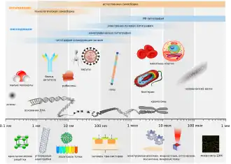 Нанодиапазон граничит на шкале масштабов с уровнем «микро» (характерный размер — микроны), который задаёт так называемые «структурно-чувствительные» свойства материала (например, для керамики — зависящие от размера зёрен), и атомарным уровнем, который определяет фундаментальные характеристики вещества. Суммарное воздействие эффектов, наблюдаемых на каждом из этих уровней, характеризует объект в целом, на макроуровне.